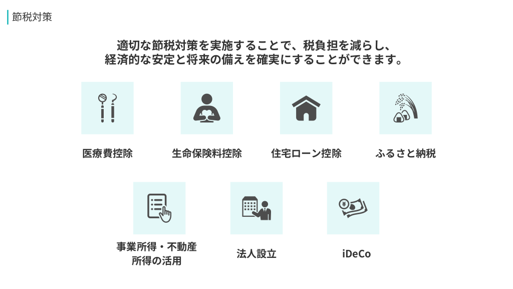 #9. 節税対策 適切な節税対策を実施することで、税負担を減らし、 経済的な安定と将来の備えを確実にすることができます。 医療費控除 生命保険料控除 事業所得・不動産 所得の活用 住宅ローン控除 法人設立 ふるさと納税 iDeCo