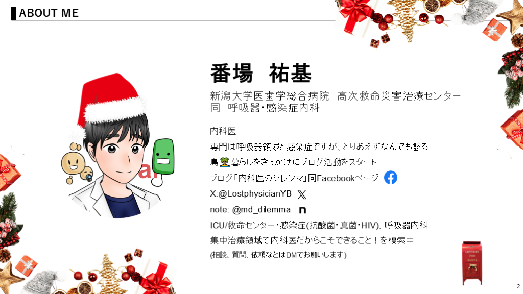 ICU/救命センター・感染症(抗酸菌・真菌・HIV)、呼吸器内科集中治療領域で内科医だからこそできること!を模索中(相談、質問、依頼などはDMでお願いします)