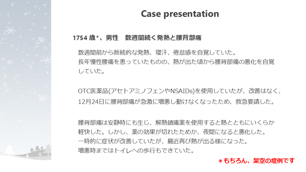 #3. Case presentation 1754 歳*、男性 数週間続く発熱と腰背部痛 数週間前から断続的な発熱、寝汗、倦怠感を自覚していた。長年慢性腰痛を患っていたものの、熱が出た頃から腰背部痛の悪化を自覚していた。