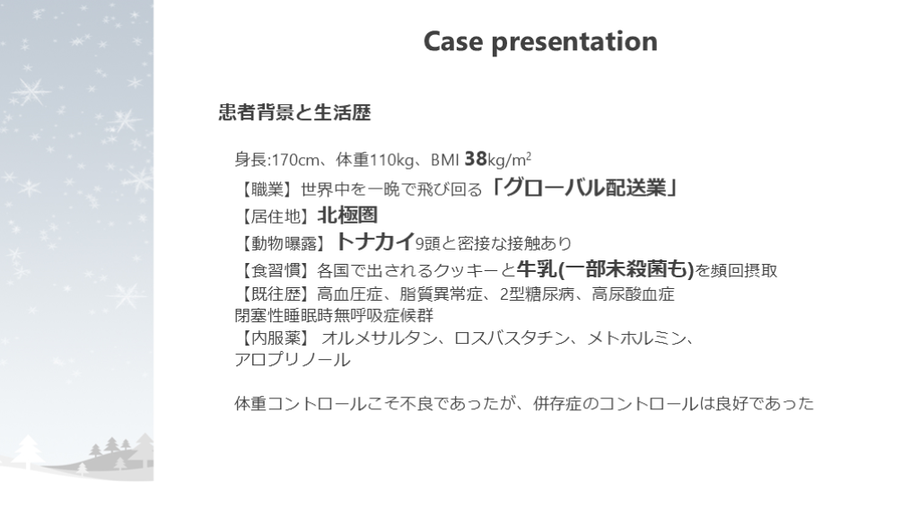 【職業】世界中を一晩で飛び回る「グローバル配送業」【居住地】北極圏【動物曝露】トナカイ9頭と密接な接触あり【食習慣】各国で出されるクッキーと牛乳(一部未殺菌も)を頻回摂取【既往歴】高血圧症、脂質異常症、2型糖尿病、高尿酸血症閉塞性睡眠時無呼吸症候群【内服薬】 オルメサルタン、ロスバスタチン、メトホルミン、アロプリノール体重コントロールこそ不良であったが、併存症のコントロールは良好であった