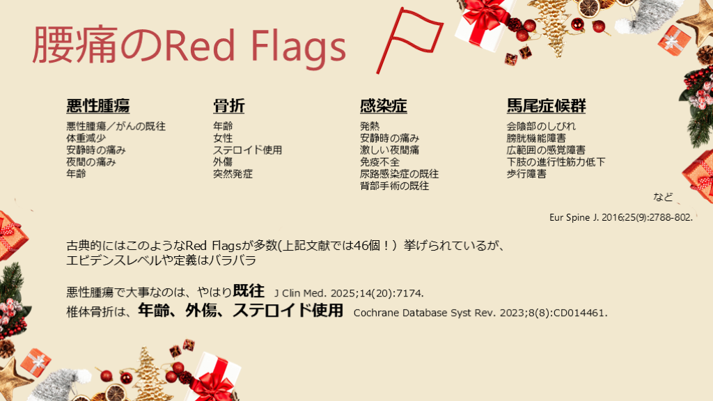 #6. 腰痛のRed Flags Eur Spine J. 2016;25(9):2788-802. など 古典的にはこのようなRed Flagsが多数(上記文献では46個!)挙げられているが、エビデンスレベルや定義はバラバラ悪性腫瘍で大事なのは、やはり既往 J Clin Med. 2025;14(20):7174.