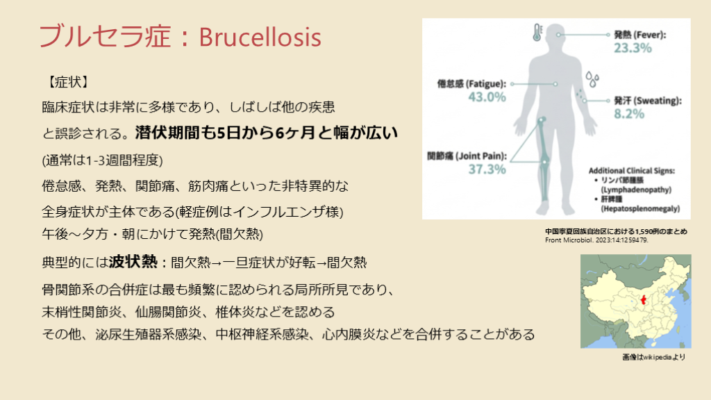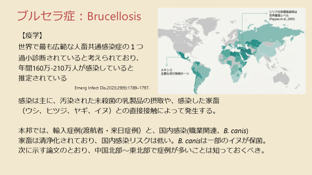 感染は主に、汚染された未殺菌の乳製品の摂取や、感染した家畜(ウシ、ヒツジ、ヤギ、イヌ)との直接接触によって発生する。本邦では、輸入症例(渡航者・来日症例)と、国内感染(職業関連、B. canis)家畜は清浄化されており、国内感染リスクは低い。B. canisは一部のイヌが保菌。次に示す論文のとおり、中国北部〜東北部で症例が多いことは知っておくべき。
