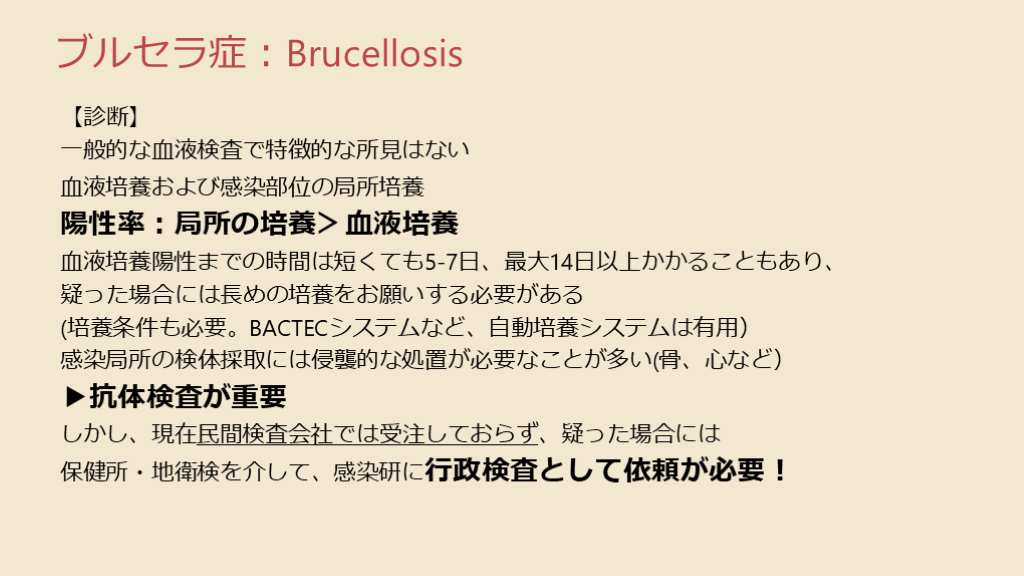 血液培養および感染部位の局所培養陽性率:局所の培養>血液培養血液培養陽性までの時間は短くても5-7日、最大14日以上かかることもあり、疑った場合には長めの培養をお願いする必要がある(培養条件も必要。BACTECシステムなど、自動培養システムは有用)感染局所の検体採取には侵襲的な処置が必要なことが多い(骨、心など)▶︎抗体検査が重要しかし、現在民間検査会社では受注しておらず、疑った場合には保健所・地衛検を介して、感染研に行政検査として依頼が必要!