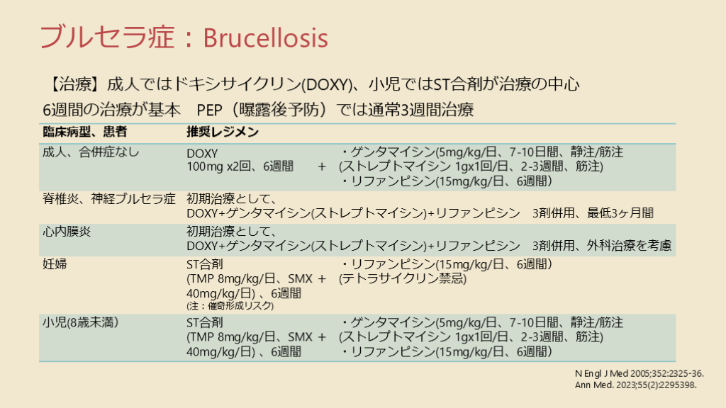 #25. ブルセラ症:Brucellosis 【治療】成人ではドキシサイクリン(DOXY)、小児ではST合剤が治療の中心6週間の治療が基本 PEP(曝露後予防)では通常3週間治療 N Engl J Med 2005;352:2325-36.