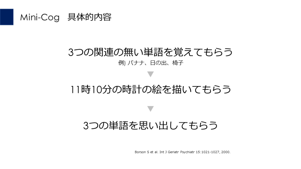 #17. Mini-Cog 具体的内容 3つの関連の無い単語を覚えてもらう