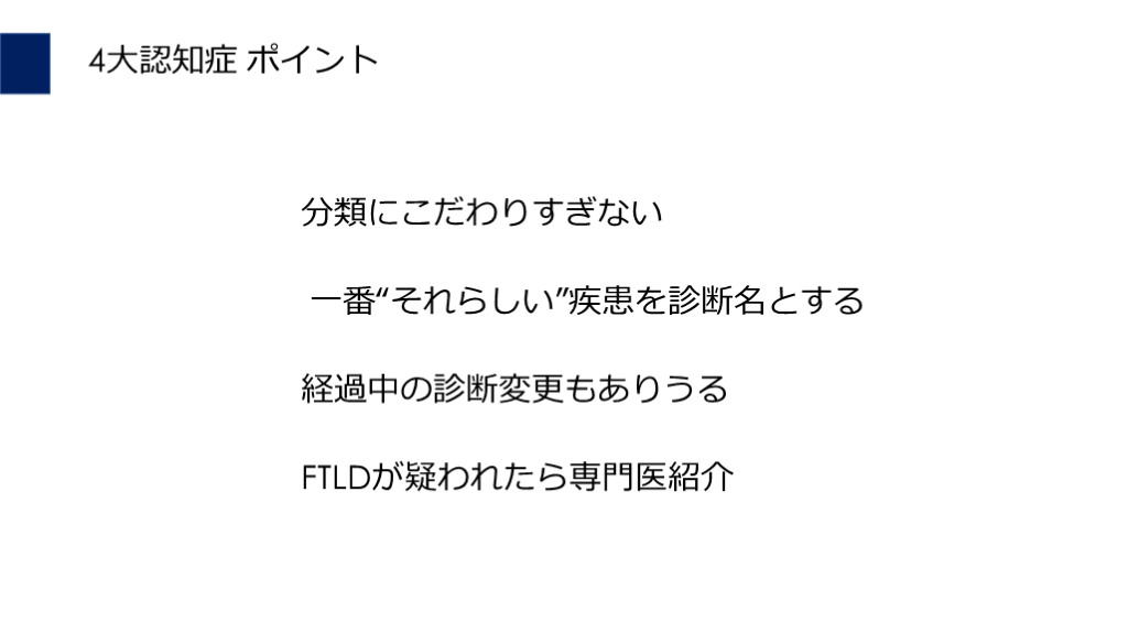#26. 4大認知症 ポイント 分類にこだわりすぎない 経過中の診断変更もありうる FTLDが疑われたら専門医紹介 一番“それらしい”疾患を診断名とする
