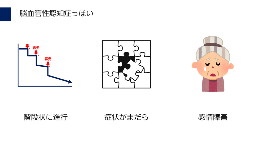 #33. 脳血管性認知症っぽい 階段状に進行 症状がまだら 感情障害