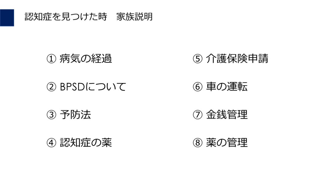 #49. 認知症を見つけた時 家族説明 ① 病気の経過 ③ 予防法 ④ 認知症の薬 ② BPSDについて ⑧ 薬の管理 ⑤ 介護保険申請 ⑥ 車の運転 ⑦ 金銭管理