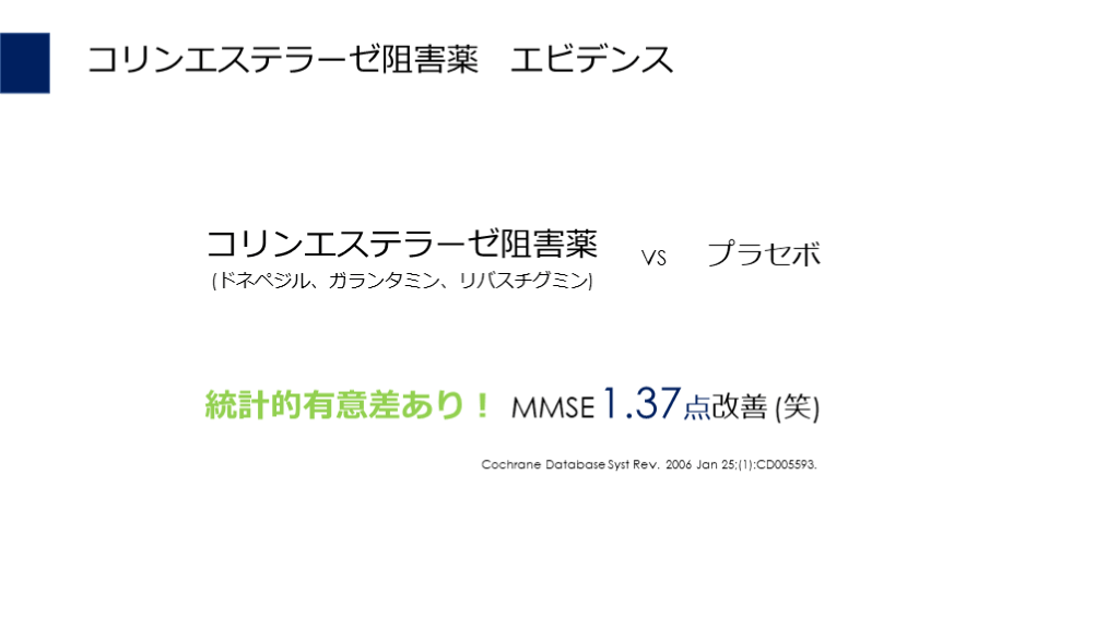 #62. コリンエステラーゼ阻害薬 エビデンス MMSE 1.37点改善 (笑) 統計的有意差あり! Cochrane Database Syst Rev. 2006 Jan 25;(1):CD005593. コリンエステラーゼ阻害薬