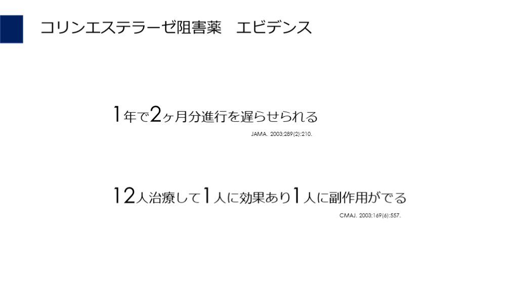 #63. コリンエステラーゼ阻害薬 エビデンス 1年で2ヶ月分進行を遅らせられる 12人治療して1人に効果あり1人に副作用がでる CMAJ. 2003;169(6):557. JAMA. 2003;289(2):210.
