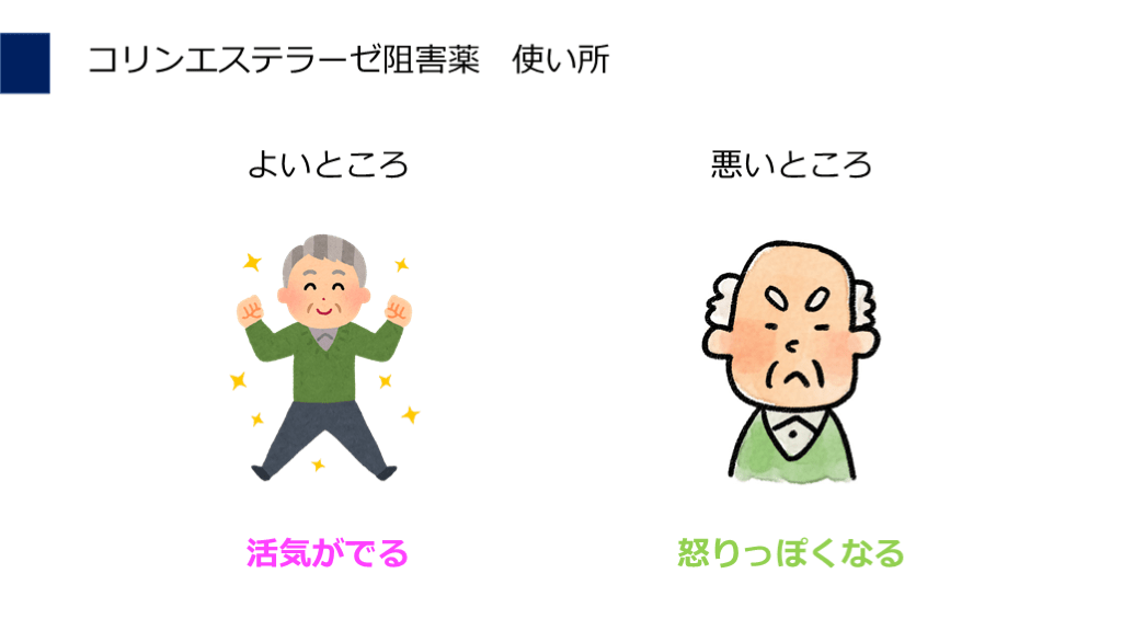 #64. コリンエステラーゼ阻害薬 使い所 よいところ 活気がでる 悪いところ 怒りっぽくなる