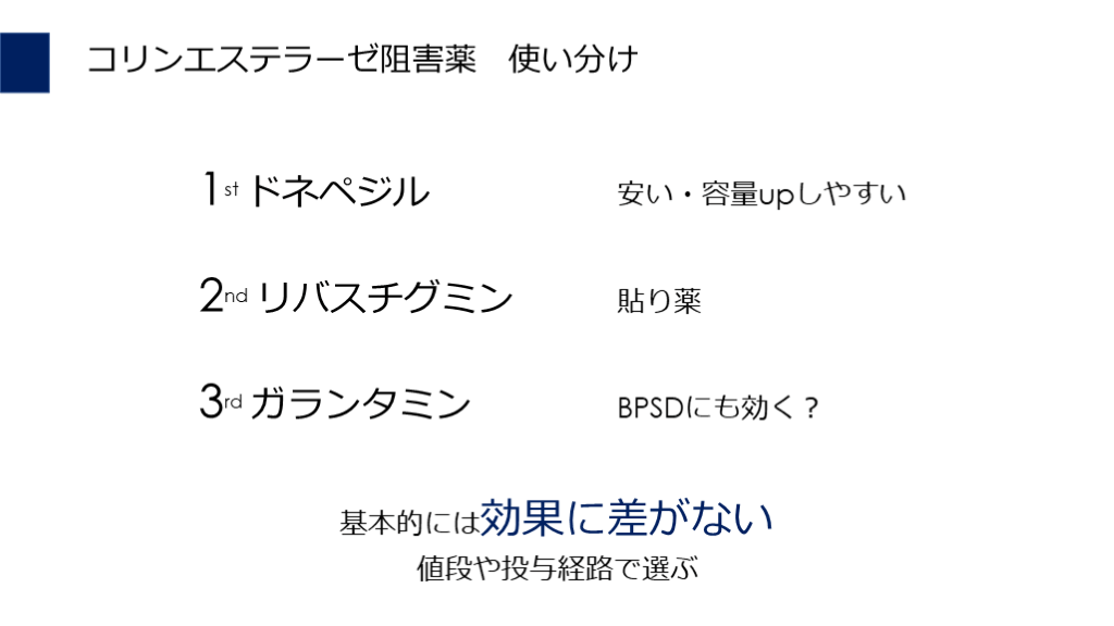 値段や投与経路で選ぶ 1st ドネペジル 2nd リバスチグミン 3rd ガランタミン 安い・容量upしやすい 貼り薬 BPSDにも効く?