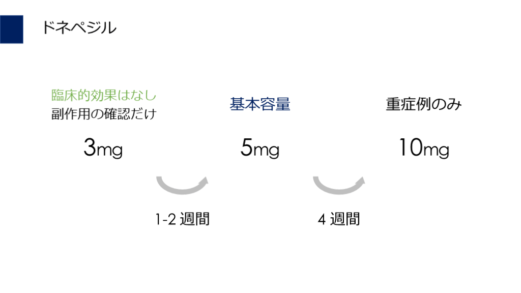 #68. ドネペジル 3mg 5mg 10mg 1-2 週間 4 週間 臨床的効果はなし