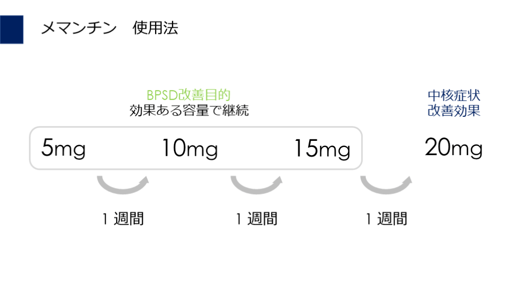 #72. メマンチン 使用法 5mg 10mg 15mg 20mg 中核症状