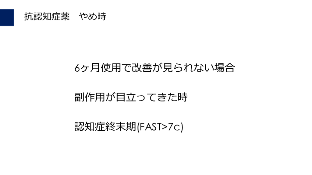 #73. 抗認知症薬 やめ時 6ヶ月使用で改善が見られない場合 副作用が目立ってきた時 認知症終末期(FAST>7c)