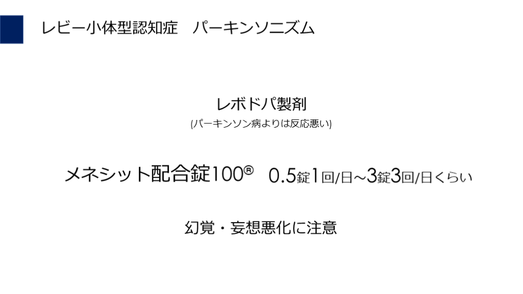 (パーキンソン病よりは反応悪い) メネシット配合錠100®︎ 0.5錠1回/日〜3錠3回/日くらい 幻覚・妄想悪化に注意