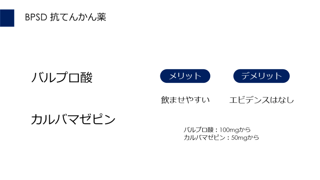 #82. BPSD 抗てんかん薬 バルプロ酸 カルバマゼピン 飲ませやすい エビデンスはなし バルプロ酸:100mgから