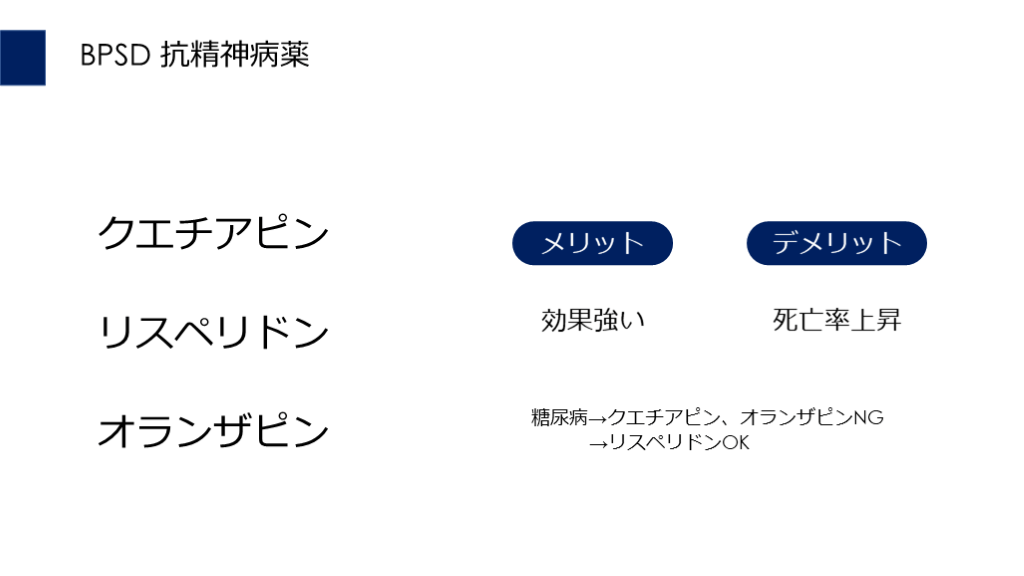 #83. BPSD 抗精神病薬 クエチアピン リスペリドン 効果強い 死亡率上昇 オランザピン 糖尿病→クエチアピン、オランザピンNG