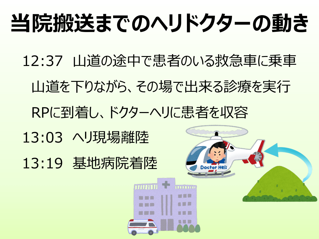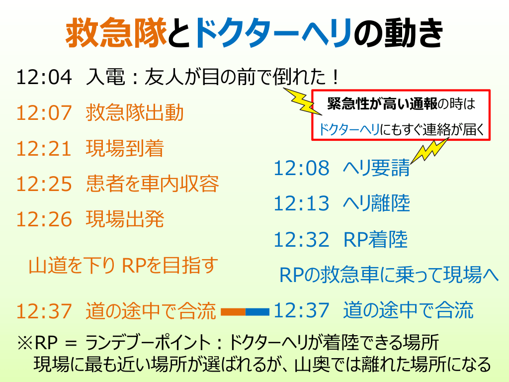 #10. 救急隊とドクターヘリの動き 12:04 ⼊電︓友⼈が⽬の前で倒れた︕ 12:07 救急隊出動 12:21 現場到着 12:25 患者を⾞内収容 12:26 現場出発 ⼭道を下り RPを⽬指す 12:37 道の途中で合流 緊急性が⾼い通報の時は ドクターヘリにもすぐ連絡が届く 12:08 ヘリ要請 12:13 ヘリ離陸 12:32 RP着陸 RPの救急⾞に乗って現場へ 12:37 道の途中で合流 ※RP = ランデブーポイント︓ドクターヘリが着陸できる場所 現場に最も近い場所が選ばれるが、⼭奥では離れた場所になる