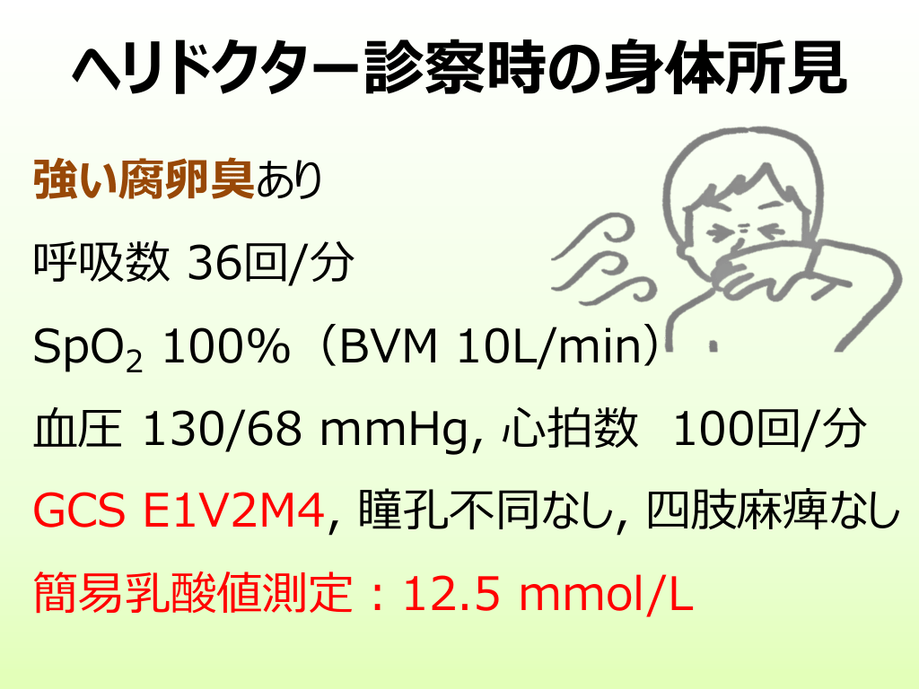 #11. ヘリドクター診察時の⾝体所⾒ 強い腐卵臭あり 呼吸数 36回/分 SpO2 100%(BVM 10L/min) ⾎圧 130/68 mmHg, ⼼拍数 100回/分 GCS E1V2M4, 瞳孔不同なし, 四肢⿇痺なし 簡易乳酸値測定︓12.5 mmol/L