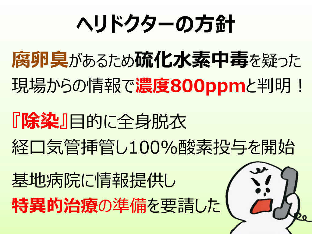 #12. ヘリドクターの⽅針 腐卵臭があるため硫化⽔素中毒を疑った 現場からの情報で濃度800ppmと判明︕ 『除染』⽬的に全⾝脱⾐ 経⼝気管挿管し100%酸素投与を開始 基地病院に情報提供し 特異的治療の準備を要請した