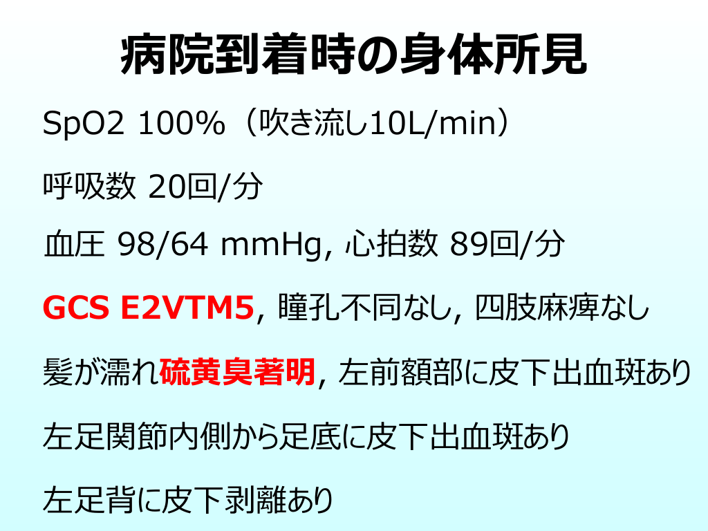 #14. 病院到着時の⾝体所⾒ SpO2 100%(吹き流し10L/min) 呼吸数 20回/分 ⾎圧 98/64 mmHg, ⼼拍数 89回/分 GCS E2VTM5, 瞳孔不同なし, 四肢⿇痺なし 髪が濡れ硫⻩臭著明, 左前額部に⽪下出⾎斑あり 左⾜関節内側から⾜底に⽪下出⾎斑あり 左⾜背に⽪下剥離あり