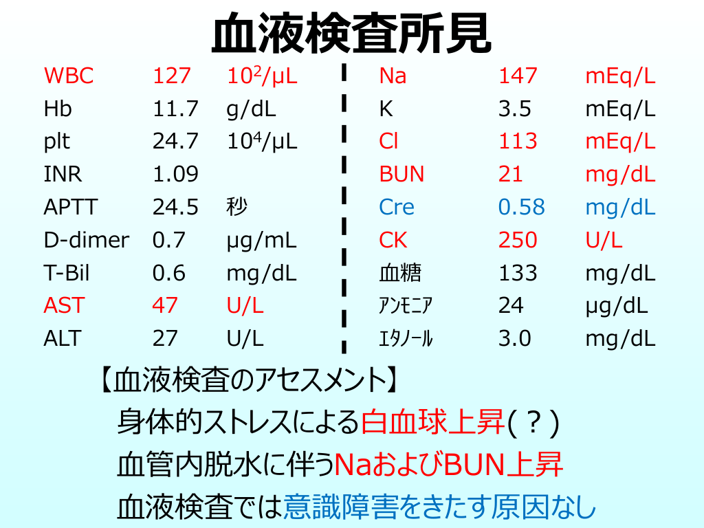 #16. WBC 127 Hb ⾎液検査所⾒ 102/μL Na 147 mEq/L 11.7 g/dL K 3.5 mEq/L plt 24.7 104/μL Cl 113 mEq/L INR 1.09 BUN 21 mg/dL APTT 24.5 秒 Cre 0.58 mg/dL D-dimer 0.7 μg/mL CK 250 U/L T-Bil 0.6 mg/dL ⾎糖 133 mg/dL AST 47 U/L アンモニア 24 μg/dL ALT 27 U/L エタノール 3.0 mg/dL 【⾎液検査のアセスメント】 ⾝体的ストレスによる⽩⾎球上昇(︖) ⾎管内脱⽔に伴うNaおよびBUN上昇 ⾎液検査では意識障害をきたす原因なし