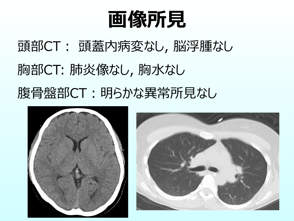 #17. 画像所⾒ 頭部CT︓ 頭蓋内病変なし, 脳浮腫なし 胸部CT: 肺炎像なし, 胸⽔なし 腹⾻盤部CT︓明らかな異常所⾒なし