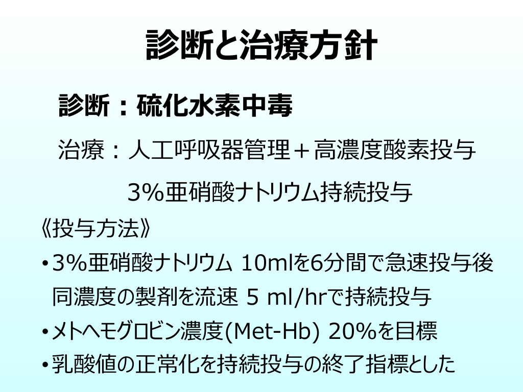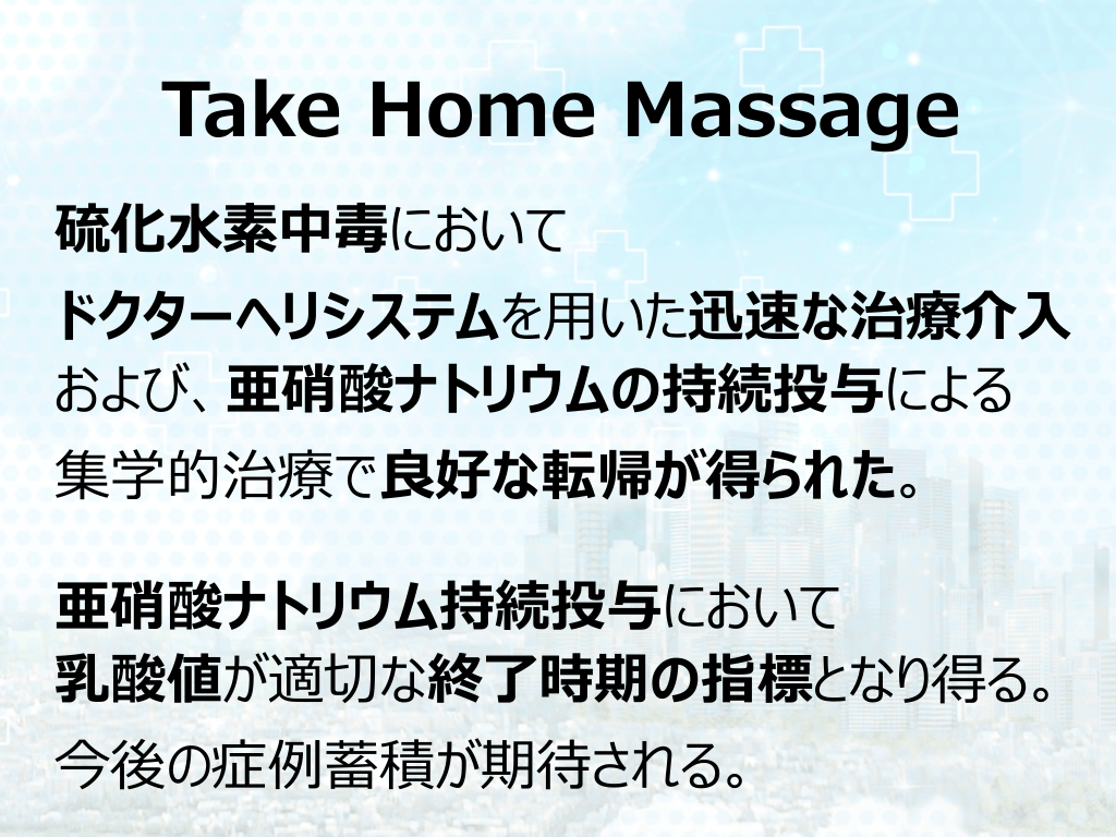 #28. Take Home Massage 硫化⽔素中毒において ドクターヘリシステムを⽤いた迅速な治療介⼊ および、亜硝酸ナトリウムの持続投与による 集学的治療で良好な転帰が得られた。 亜硝酸ナトリウム持続投与において 乳酸値が適切な終了時期の指標となり得る。 今後の症例蓄積が期待される。