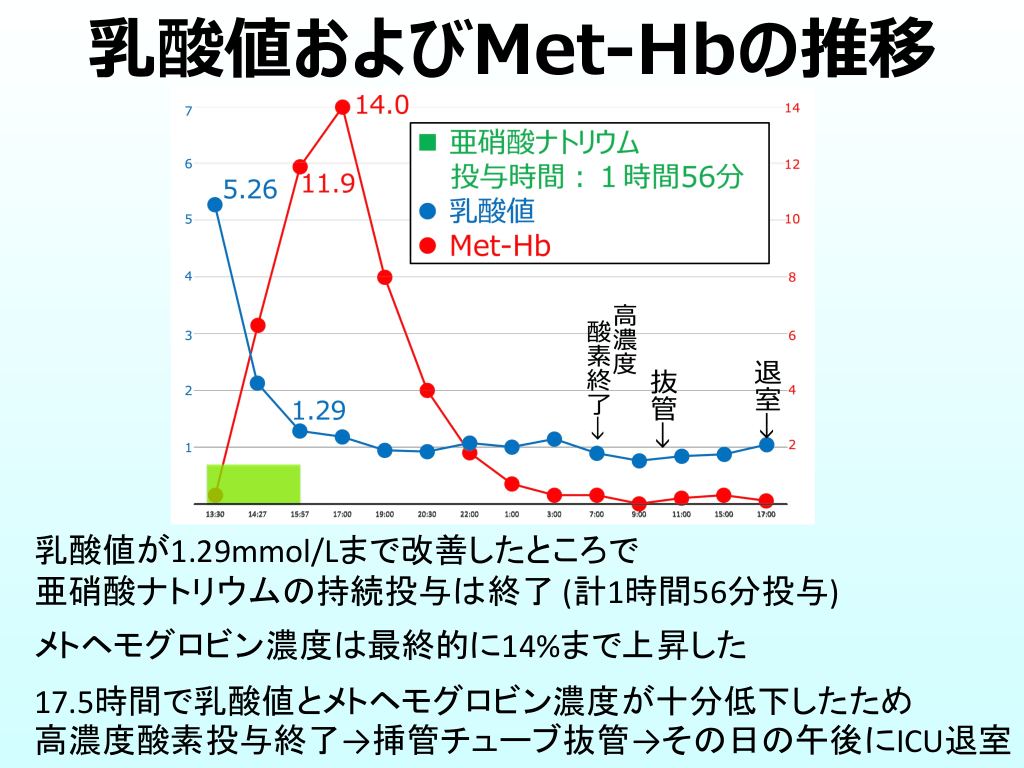 #19. 乳酸値およびMet-Hbの推移 乳酸値が1.29mmol/Lまで改善したところで 亜硝酸ナトリウムの持続投与は終了 (計1時間56分投与) メトヘモグロビン濃度は最終的に14%まで上昇した 17.5時間で乳酸値とメトヘモグロビン濃度が十分低下したため 高濃度酸素投与終了→挿管チューブ抜管→その日の午後にICU退室