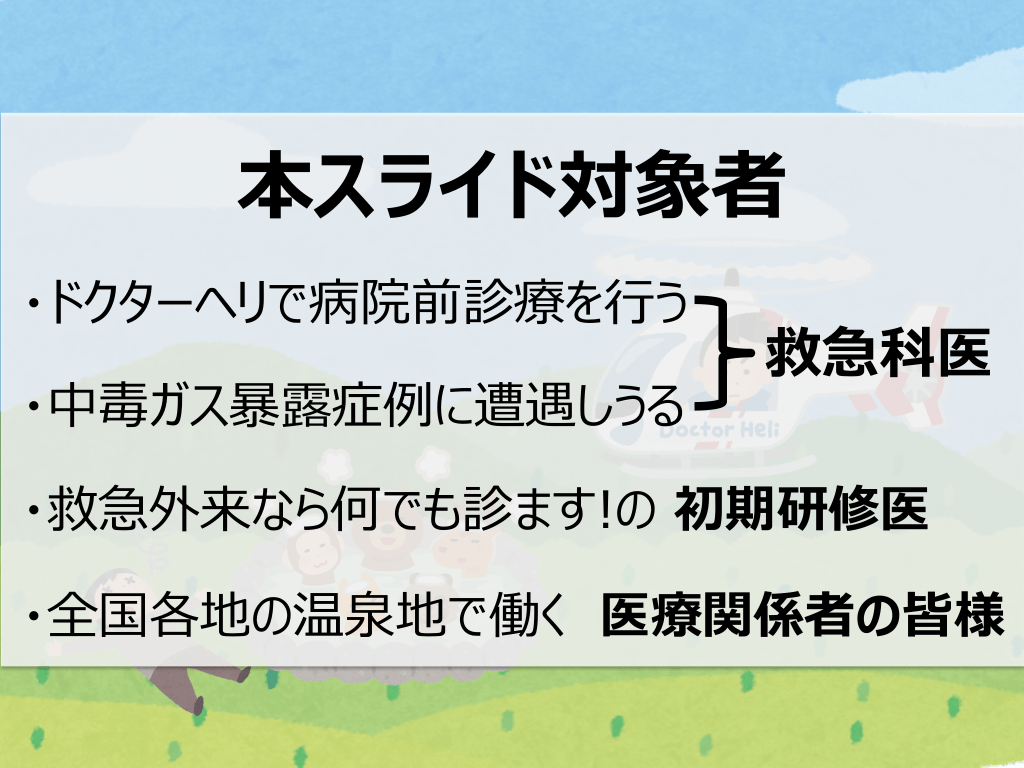 #2. 本スライド対象者 ・ドクターヘリで病院前診療を⾏う ・中毒ガス暴露症例に遭遇しうる 救急科医 ・救急外来なら何でも診ます!の 初期研修医 ・全国各地の温泉地で働く 医療関係者の皆様