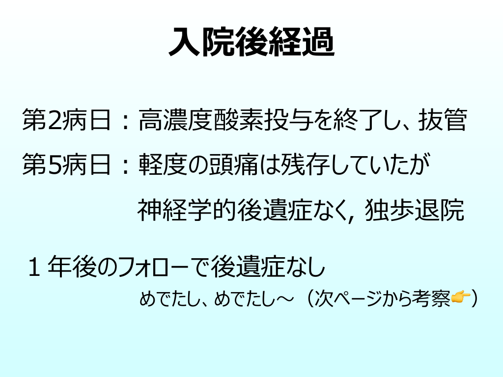 #20. ⼊院後経過 第2病⽇︓⾼濃度酸素投与を終了し、抜管 第5病⽇︓軽度の頭痛は残存していたが 神経学的後遺症なく, 独歩退院 1年後のフォローで後遺症なし めでたし、めでたし〜(次ページから考察👉)