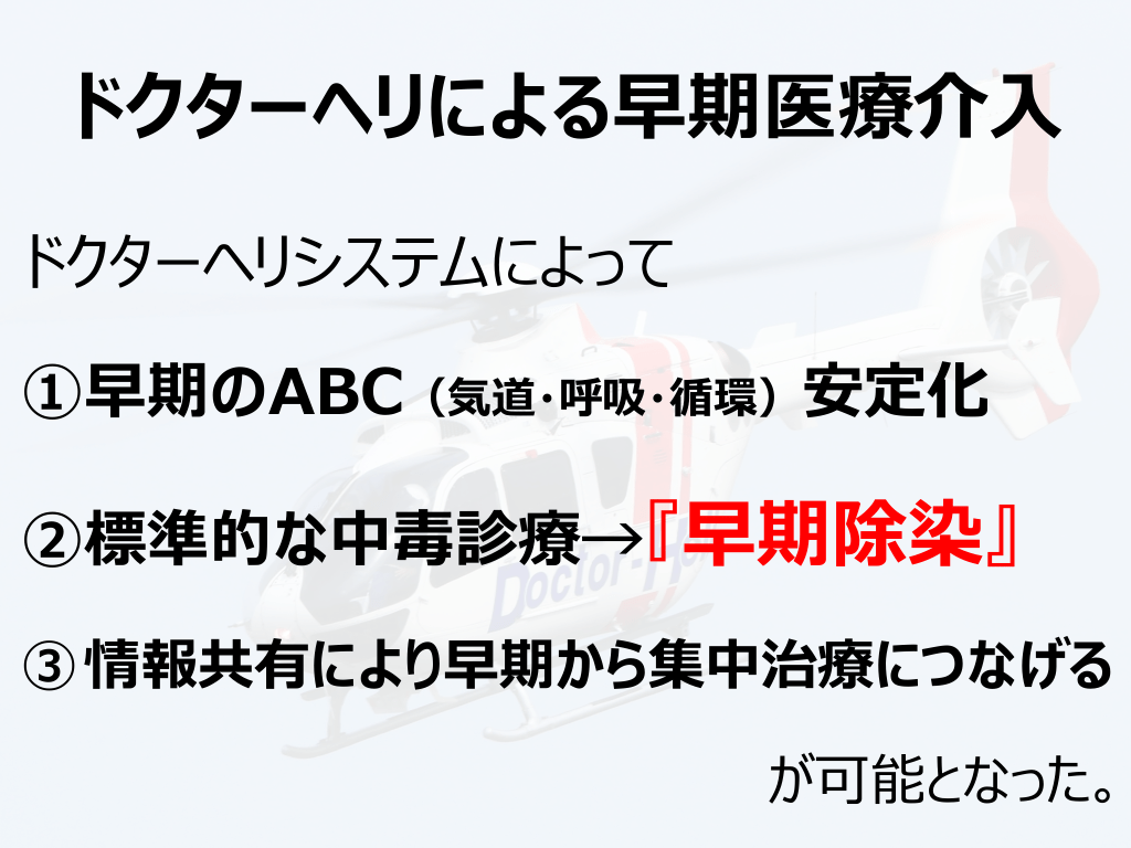 #21. ドクターヘリによる早期医療介⼊ ドクターヘリシステムによって ①早期のABC(気道・呼吸・循環)安定化 ②標準的な中毒診療→『早期除染』 ③ 情報共有により早期から集中治療につなげる が可能となった。