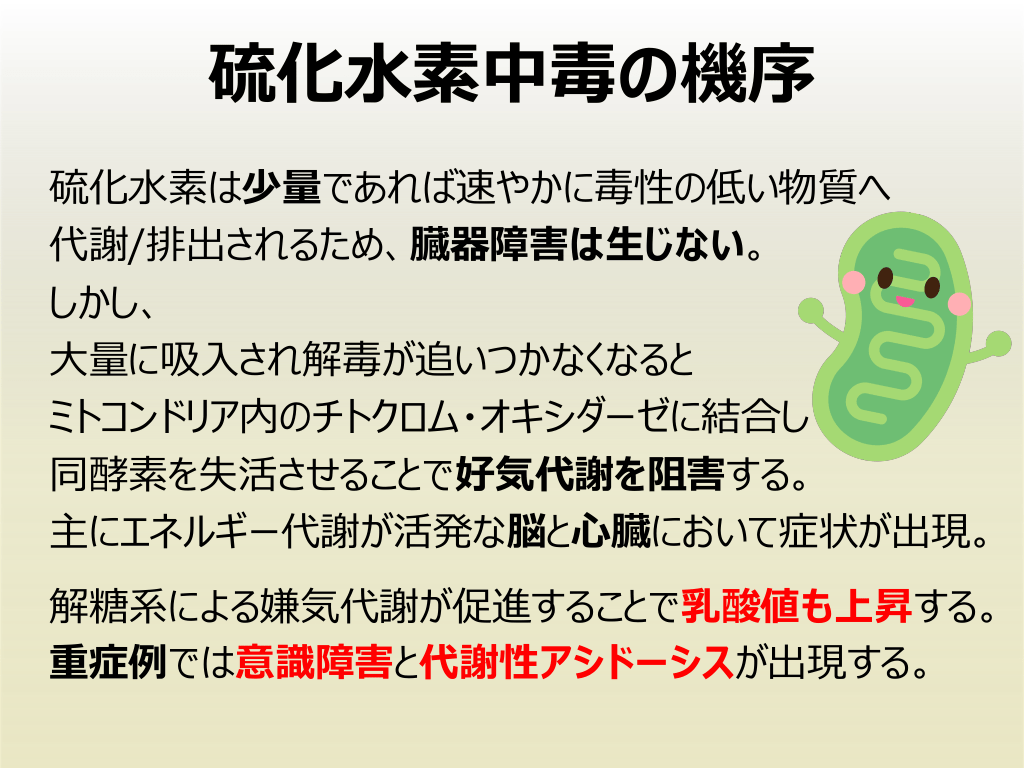 #22. 硫化⽔素中毒の機序 硫化⽔素は少量であれば速やかに毒性の低い物質へ 代謝/排出されるため、臓器障害は⽣じない。 しかし、 ⼤量に吸⼊され解毒が追いつかなくなると ミトコンドリア内のチトクロム・オキシダーゼに結合し 同酵素を失活させることで好気代謝を阻害する。 主にエネルギー代謝が活発な脳と⼼臓において症状が出現。 解糖系による嫌気代謝が促進することで乳酸値も上昇する。 重症例では意識障害と代謝性アシドーシスが出現する。