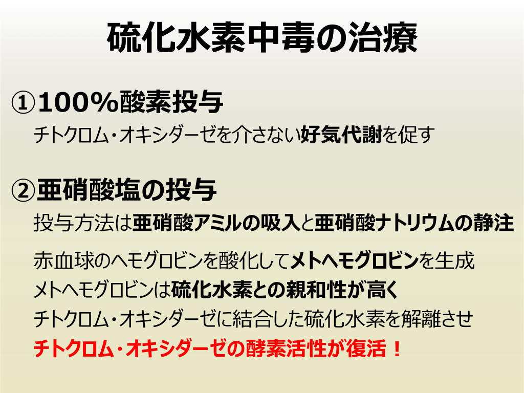 #23. 硫化⽔素中毒の治療 ①100%酸素投与 チトクロム・オキシダーゼを介さない好気代謝を促す ②亜硝酸塩の投与 投与⽅法は亜硝酸アミルの吸⼊と亜硝酸ナトリウムの静注 ⾚⾎球のヘモグロビンを酸化してメトヘモグロビンを⽣成 メトヘモグロビンは硫化⽔素との親和性が⾼く チトクロム・オキシダーゼに結合した硫化⽔素を解離させ チトクロム・オキシダーゼの酵素活性が復活︕