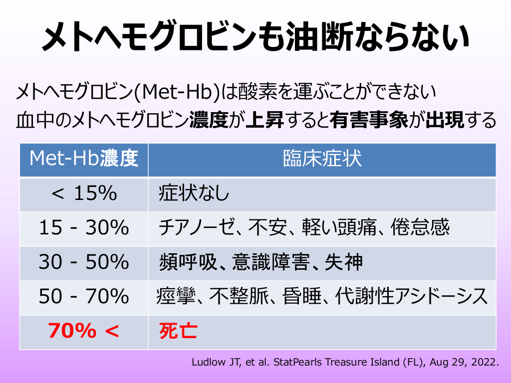 #24. メトヘモグロビンも油断ならない メトヘモグロビン(Met-Hb)は酸素を運ぶことができない ⾎中のメトヘモグロビン濃度が上昇すると有害事象が出現する Met-Hb濃度 < 15% 臨床症状 症状なし 15 - 30% チアノーゼ、不安、軽い頭痛、倦怠感 30 - 50% 頻呼吸、意識障害、失神 50 - 70% 痙攣、不整脈、昏睡、代謝性アシドーシス 70% < 死亡 Ludlow JT, et al. StatPearls Treasure Island (FL), Aug 29, 2022.