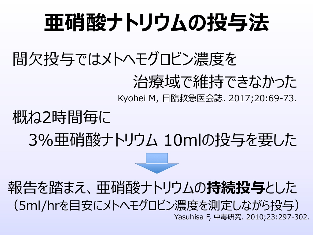 #25. 亜硝酸ナトリウムの投与法 間⽋投与ではメトヘモグロビン濃度を 治療域で維持できなかった Kyohei M, ⽇臨救急医会誌. 2017;20:69-73. 概ね2時間毎に 3%亜硝酸ナトリウム 10mlの投与を要した 報告を踏まえ、亜硝酸ナトリウムの持続投与とした (5ml/hrを⽬安にメトヘモグロビン濃度を測定しながら投与) Yasuhisa F, 中毒研究. 2010;23:297-302.