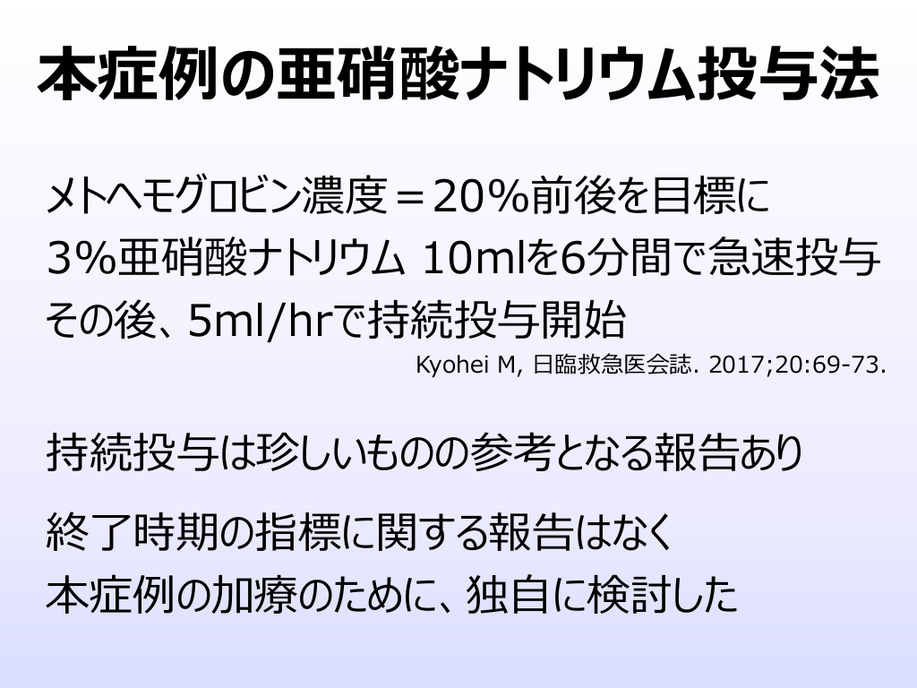 #26. 本症例の亜硝酸ナトリウム投与法 メトヘモグロビン濃度=20%前後を⽬標に 3%亜硝酸ナトリウム 10mlを6分間で急速投与 その後、5ml/hrで持続投与開始 Kyohei M, ⽇臨救急医会誌. 2017;20:69-73. 持続投与は珍しいものの参考となる報告あり 終了時期の指標に関する報告はなく 本症例の加療のために、独⾃に検討した
