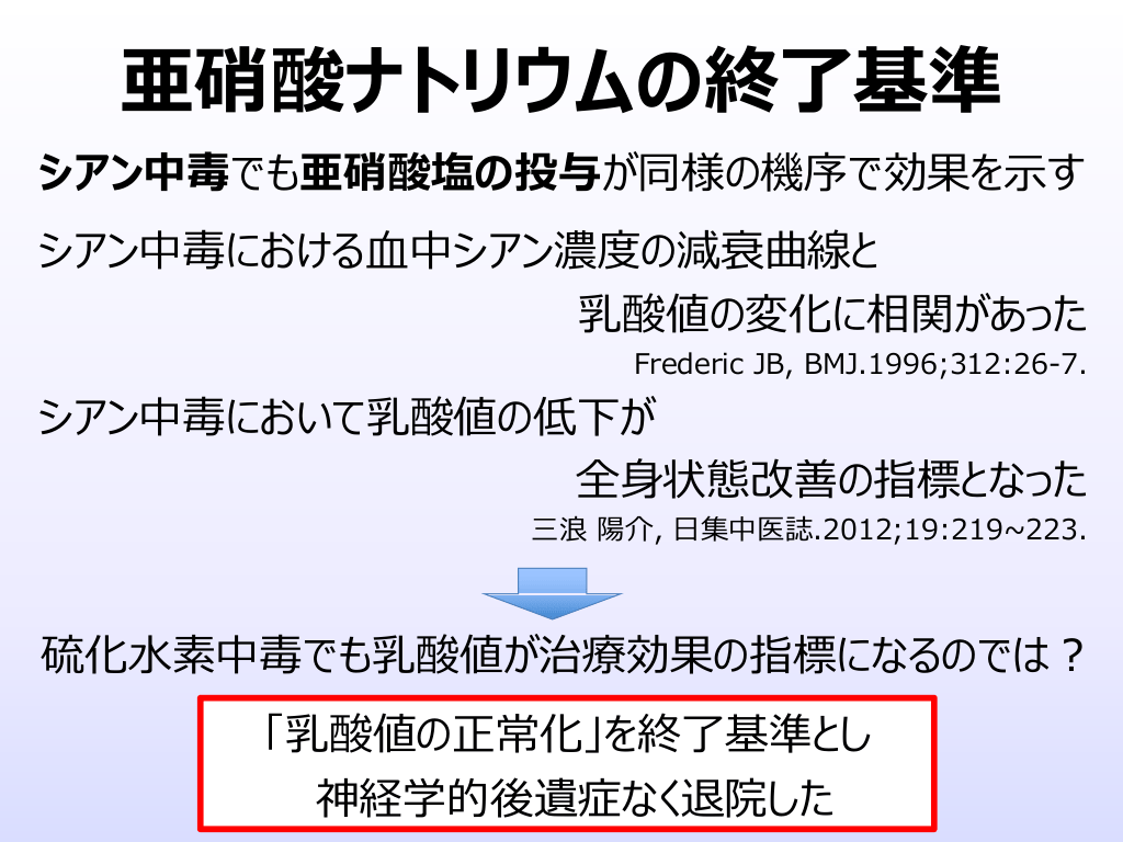 #27. 亜硝酸ナトリウムの終了基準 シアン中毒でも亜硝酸塩の投与が同様の機序で効果を⽰す シアン中毒における⾎中シアン濃度の減衰曲線と 乳酸値の変化に相関があった Frederic JB, BMJ.1996;312:26-7. シアン中毒において乳酸値の低下が 全⾝状態改善の指標となった 三浪 陽介, ⽇集中医誌.2012;19:219~223. 硫化⽔素中毒でも乳酸値が治療効果の指標になるのでは︖ 「乳酸値の正常化」を終了基準とし 神経学的後遺症なく退院した