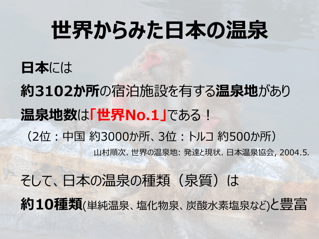 #3. 世界からみた⽇本の温泉 ⽇本には 約3102か所の宿泊施設を有する温泉地があり 温泉地数は「世界No.1」である︕ (2位︓中国 約3000か所、3位︓トルコ 約500か所) ⼭村順次. 世界の温泉地: 発達と現状. ⽇本温泉協会, 2004.5. そして、⽇本の温泉の種類(泉質)は 約10種類(単純温泉、塩化物泉、炭酸⽔素塩泉など)と豊富