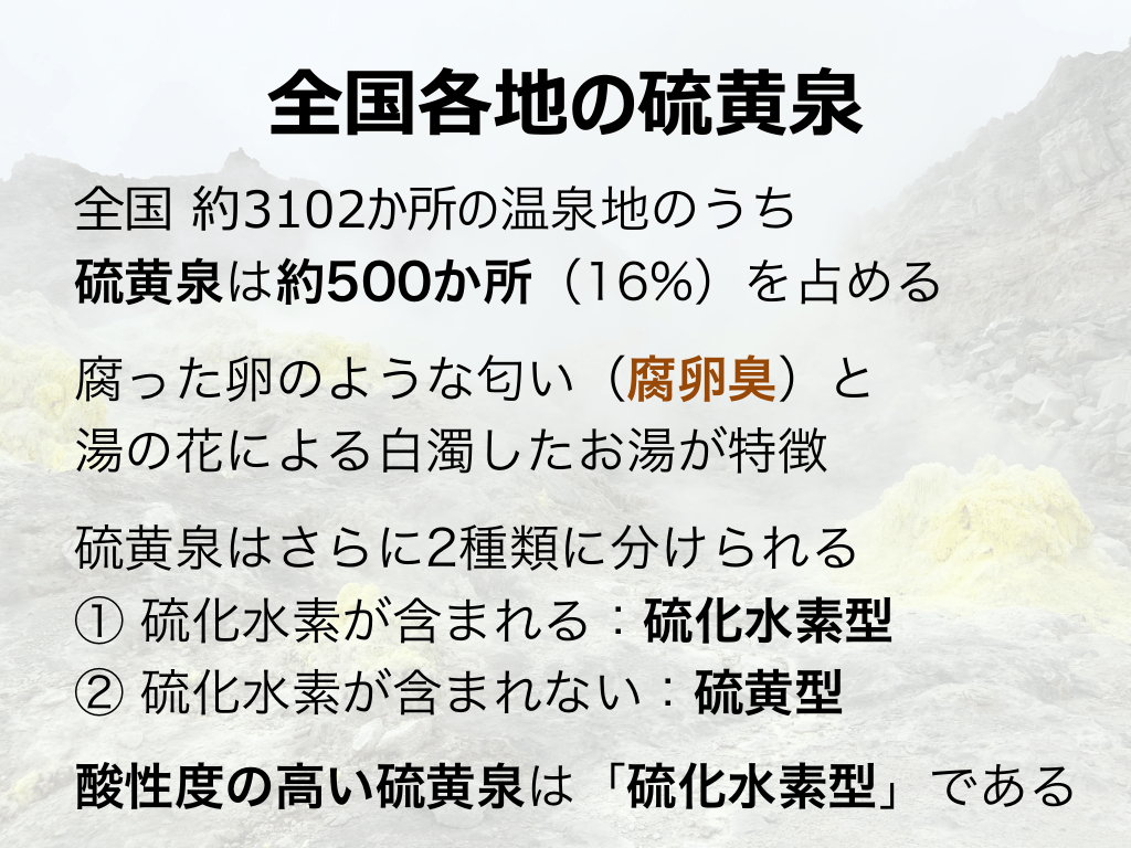 #4. 全国各地の硫⻩泉 全国 約3102か所の温泉地のうち 硫黄泉は約500か所(16%)を占める 腐った卵のような匂い(腐卵臭)と 湯の花による白濁したお湯が特徴 硫黄泉はさらに2種類に分けられる ① 硫化水素が含まれる:硫化水素型 ② 硫化水素が含まれない:硫黄型 酸性度の高い硫黄泉は「硫化水素型」である