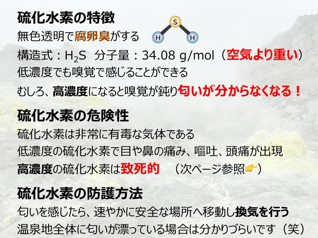#5. 硫化⽔素の特徴 無⾊透明で腐卵臭がする 構造式︓H2S 分⼦量︓34.08 g/mol(空気より重い) 低濃度でも嗅覚で感じることができる むしろ、⾼濃度になると嗅覚が鈍り匂いが分からなくなる︕ 硫化⽔素の危険性 硫化⽔素は⾮常に有毒な気体である 低濃度の硫化⽔素で⽬や⿐の痛み、嘔吐、頭痛が出現 ⾼濃度の硫化⽔素は致死的 (次ページ参照👉) 硫化⽔素の防護⽅法 匂いを感じたら、速やかに安全な場所へ移動し換気を⾏う 温泉地全体に匂いが漂っている場合は分かりづらいです(笑)
