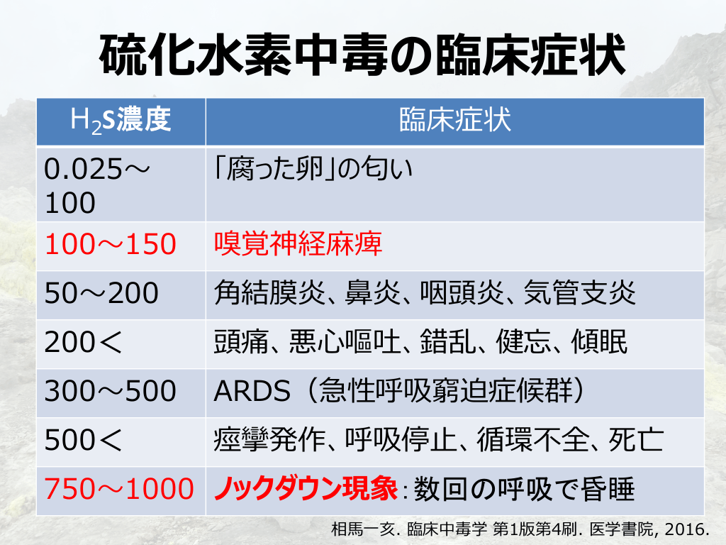 #6. 硫化⽔素中毒の臨床症状 H2S濃度 臨床症状 0.025〜 100 100〜150 「腐った卵」の匂い 50〜200 ⾓結膜炎、⿐炎、咽頭炎、気管⽀炎 200< 頭痛、悪⼼嘔吐、錯乱、健忘、傾眠 300〜500 ARDS(急性呼吸窮迫症候群) 500< 痙攣発作、呼吸停⽌、循環不全、死亡 嗅覚神経⿇痺 750〜1000 ノックダウン現象:数回の呼吸で昏睡 相⾺⼀亥. 臨床中毒学 第1版第4刷. 医学書院, 2016.
