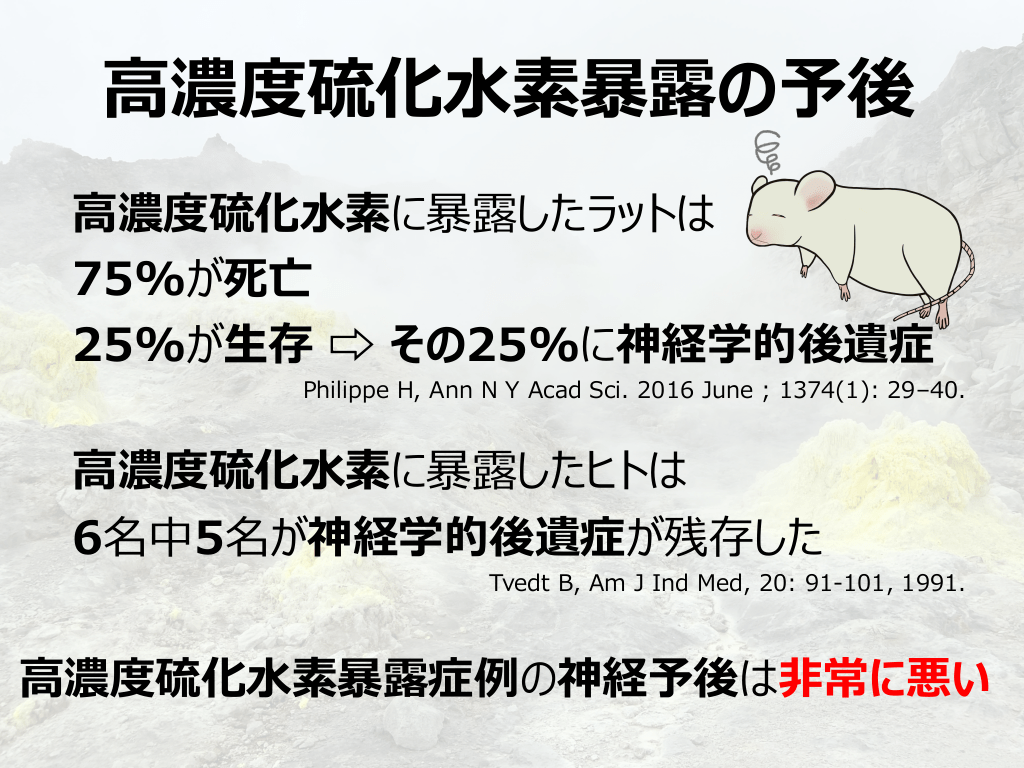 #7. ⾼濃度硫化⽔素暴露の予後 ⾼濃度硫化⽔素に暴露したラットは 75%が死亡 25%が⽣存 ⇨ その25%に神経学的後遺症 Philippe H, Ann N Y Acad Sci. 2016 June ; 1374(1): 29–40. ⾼濃度硫化⽔素に暴露したヒトは 6名中5名が神経学的後遺症が残存した Tvedt B, Am J Ind Med, 20: 91-101, 1991. ⾼濃度硫化⽔素暴露症例の神経予後は⾮常に悪い