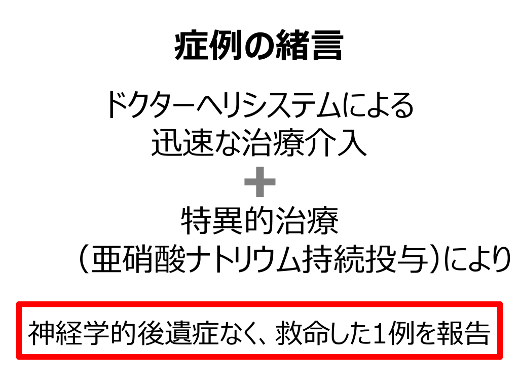 #8. 症例の緒⾔ ドクターヘリシステムによる 迅速な治療介⼊ 特異的治療 により (亜硝酸ナトリウム持続投与) 神経学的後遺症なく、救命した1例を報告