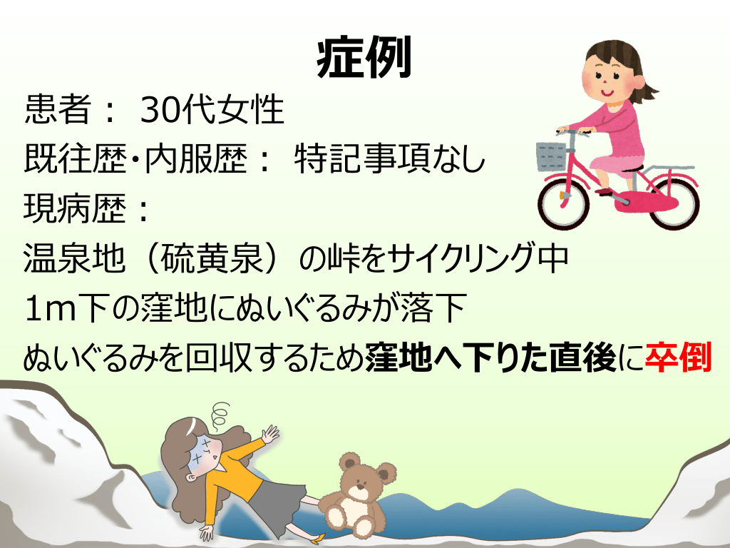 #9. 症例 患者︓ 30代⼥性 既往歴・内服歴︓ 特記事項なし 現病歴︓ 温泉地(硫⻩泉)の峠をサイクリング中 1m下の窪地にぬいぐるみが落下 ぬいぐるみを回収するため窪地へ下りた直後に卒倒