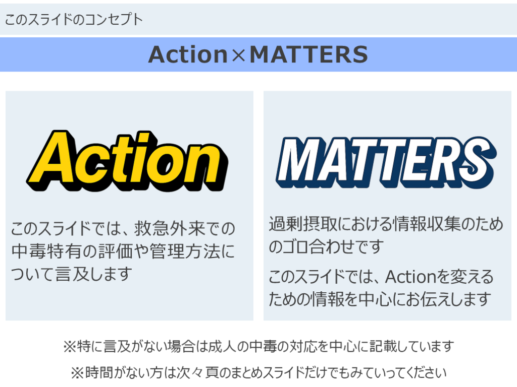 このスライドでは、Actionを変えるための情報を中心にお伝えします ※特に言及がない場合は成人の中毒の対応を中心に記載しています ※時間がない方は次々頁のまとめスライドだけでもみていってください
