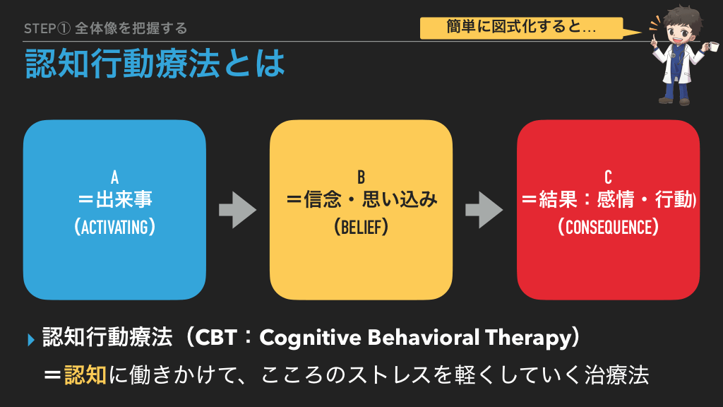 #10. 簡単に図式化すると… STEP① 全体像を把握する 認知行動療法とは A =出来事 (ACTIVATING) B =信念・思い込み (BELIEF) C =結果:感情・行動) (CONSEQUENCE) ▸ 認知行動療法(CBT:Cognitive Behavioral Therapy) =認知に働きかけて、こころのストレスを軽くしていく治療法