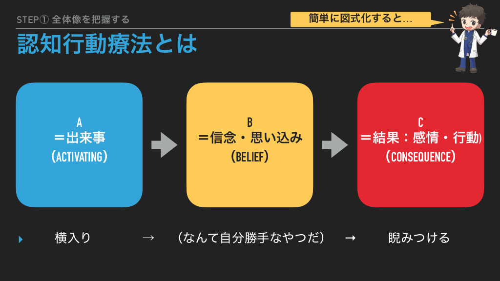 #11. コロナ明け久々の飲酒… 簡単に図式化すると… STEP① 全体像を把握する 認知行動療法とは A =出来事 (ACTIVATING) ▸ 横入り C =結果:感情・行動) (CONSEQUENCE) B =信念・思い込み (BELIEF) → (なんて自分勝手なやつだ) → 睨みつける