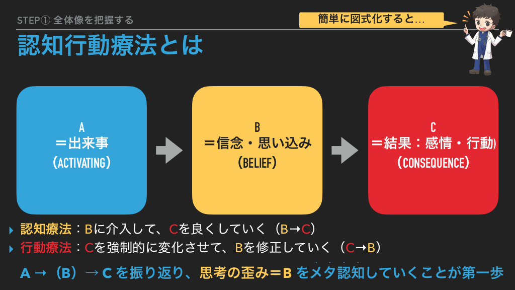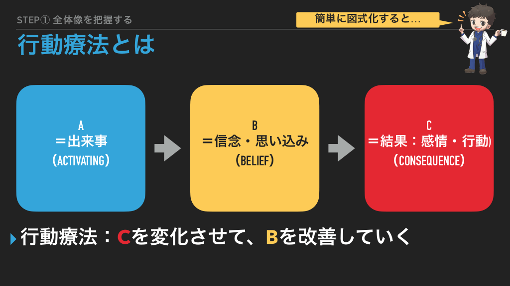 #30. 簡単に図式化すると… STEP① 全体像を把握する 行動療法とは A =出来事 (ACTIVATING) B =信念・思い込み (BELIEF) C =結果:感情・行動) (CONSEQUENCE) ▸ 行動療法:Cを変化させて、Bを改善していく